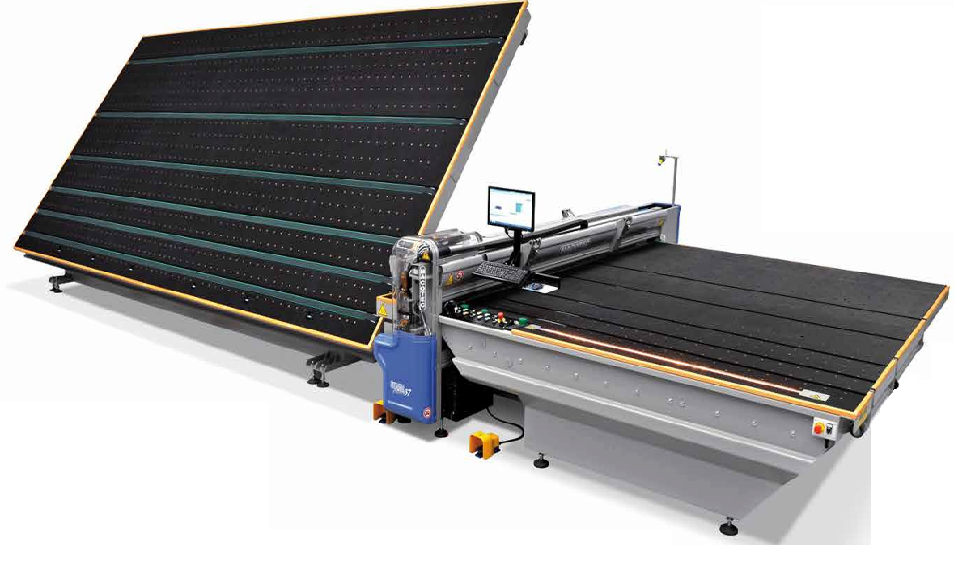 Αυτόματος πάγκος κοπής υαλοπινάκων τρίπλεξ με πρόγραμμα βελτιστοποίησης, λεπίδα κοπής PVB, ηλεκτρονικό διαχωριστή και ανακλινόμενο τραπέζι για εκφόρτωση του γυαλιού.
