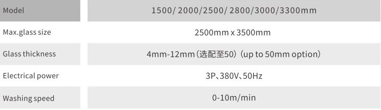 Αποτελείται από μεταφορικό ιμάντα εισόδου και εξόδου και πλυντήριο. Η δομή του πλυντηρίου είναι κατασκευασμένη από ανοξείδωτο χάλυβα υψηλής ποιότητας. Προσαρμοσμένες επιλογές: αυτόματη ρύθμιση πάχους γυαλιού (μέγιστο πάχος έως 50 mm), σύστημα φιλτραρίσματος νερού, ανεμιστήρας με μετατροπέα.